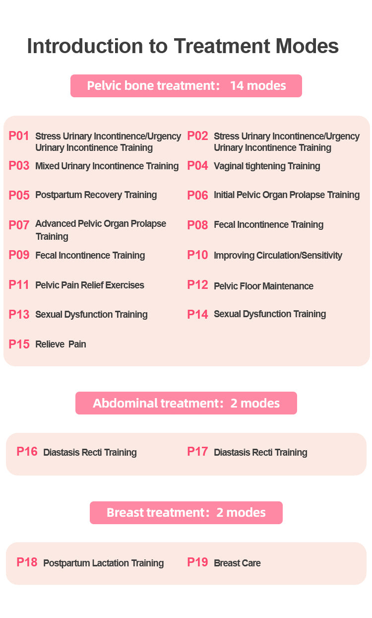 - 19 behandlingsprogram – Anpassade för t.ex. träning efter förlossning, sexuell funktion, inkontinens, smärtlindring och diastas recti (rectus abdominis separation).