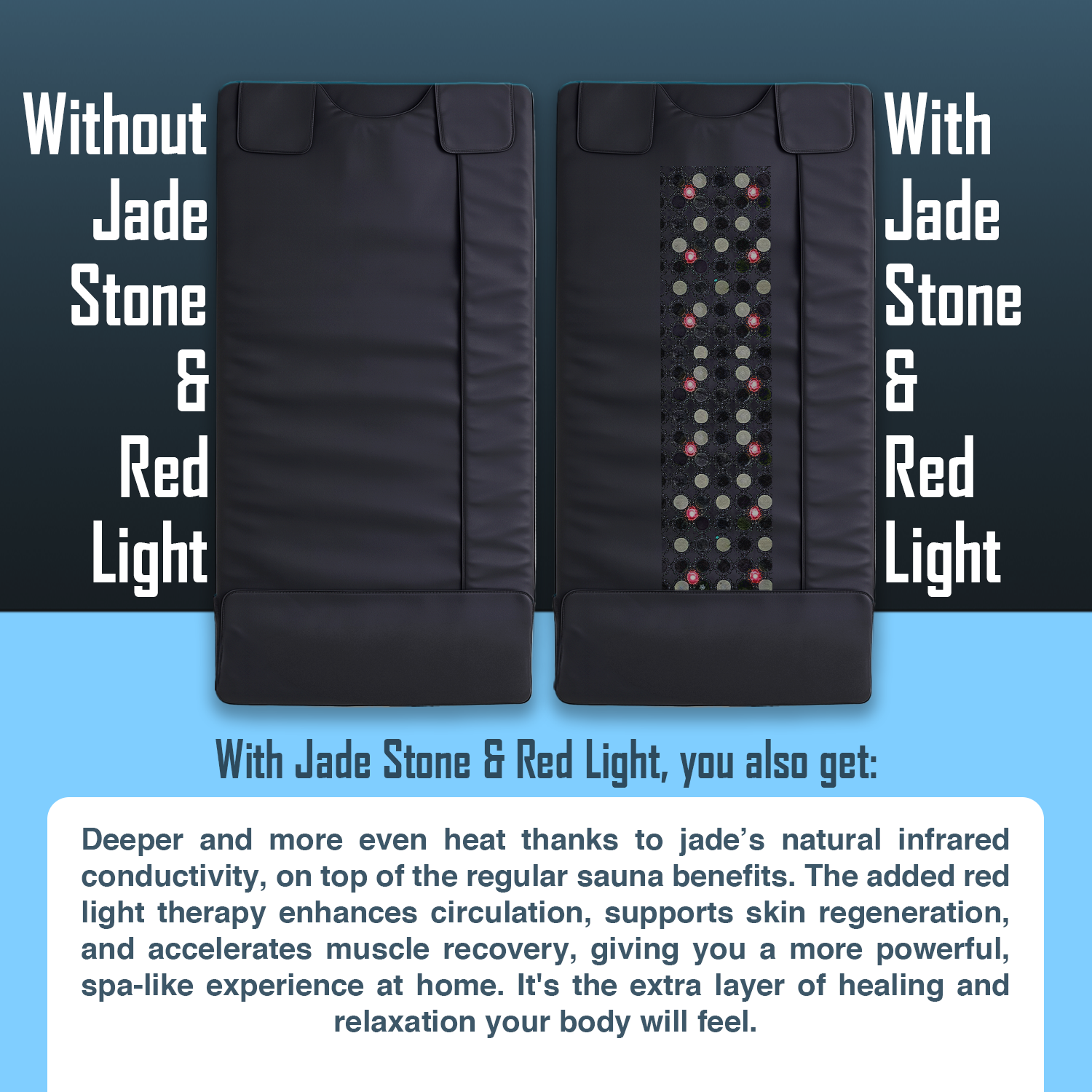 Djupare och jämnare värme tack vare jadens naturliga förmåga att leda infraröd energi – utöver de vanliga bastufördelarna. Det röda ljuset stimulerar blodcirkulationen, främjar hudens förnyelse och påskyndar muskelåterhämtning. En extra nivå av avslappning och återhämtning som verkligen känns – som ett personligt hemmaspa med terapeutisk effekt.